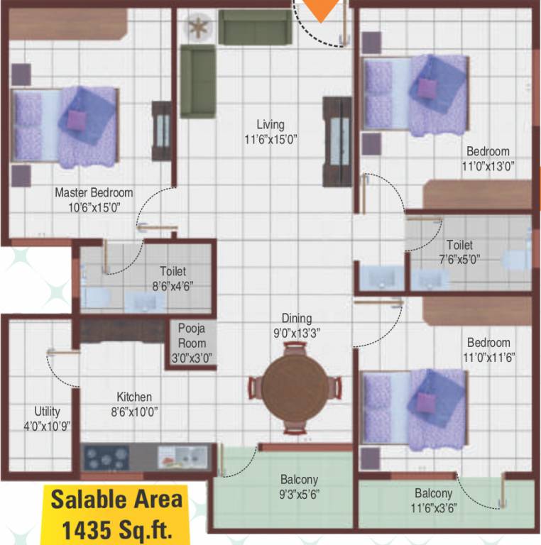 3BHK+2T (1,435 sq ft) Pooja Room