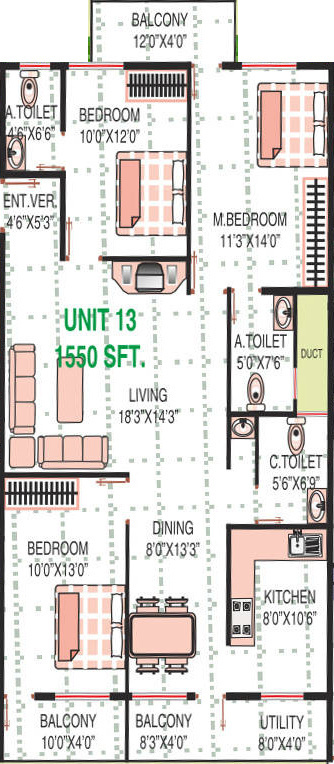 3BHK+3T (1,550 sq ft)