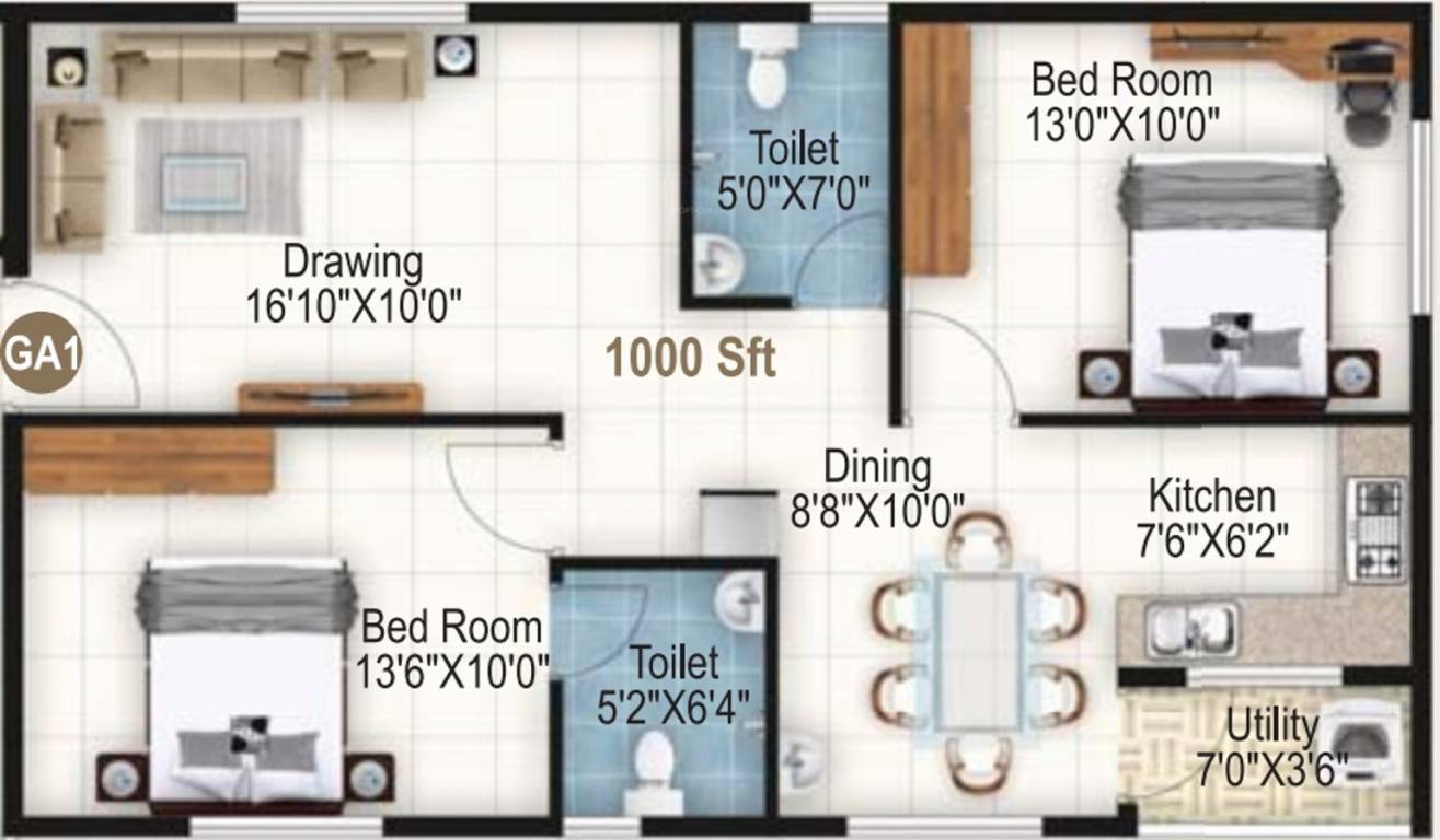 2BHK+2T (1,000 sq ft)