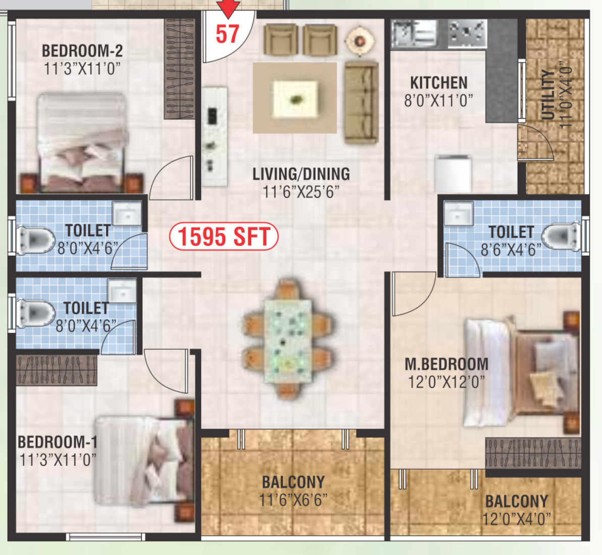 ![]() | 1595 sq ft (3BHK+3T) | - |