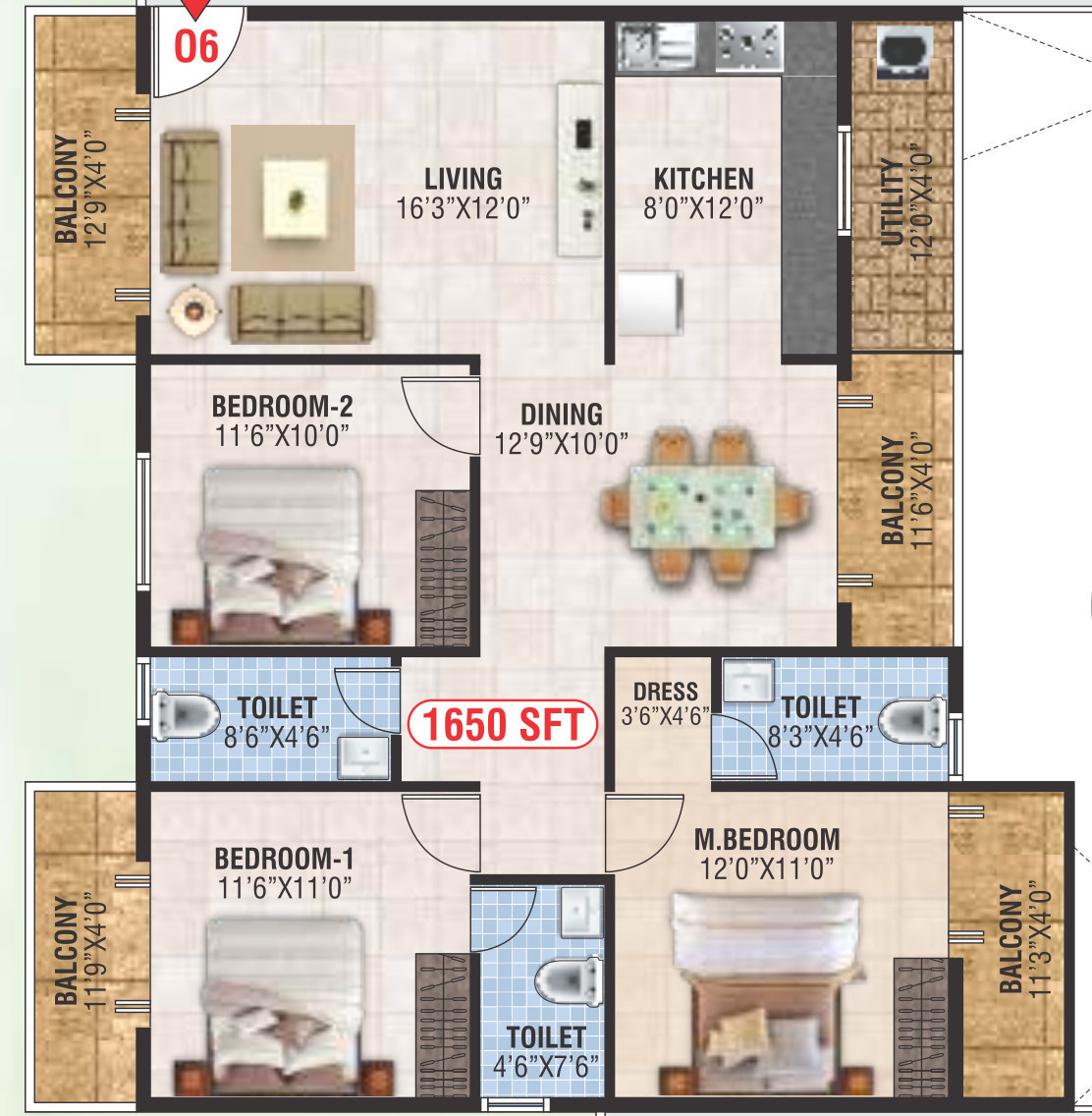 ![]() | 1655 sq ft (3BHK+3T) | - |