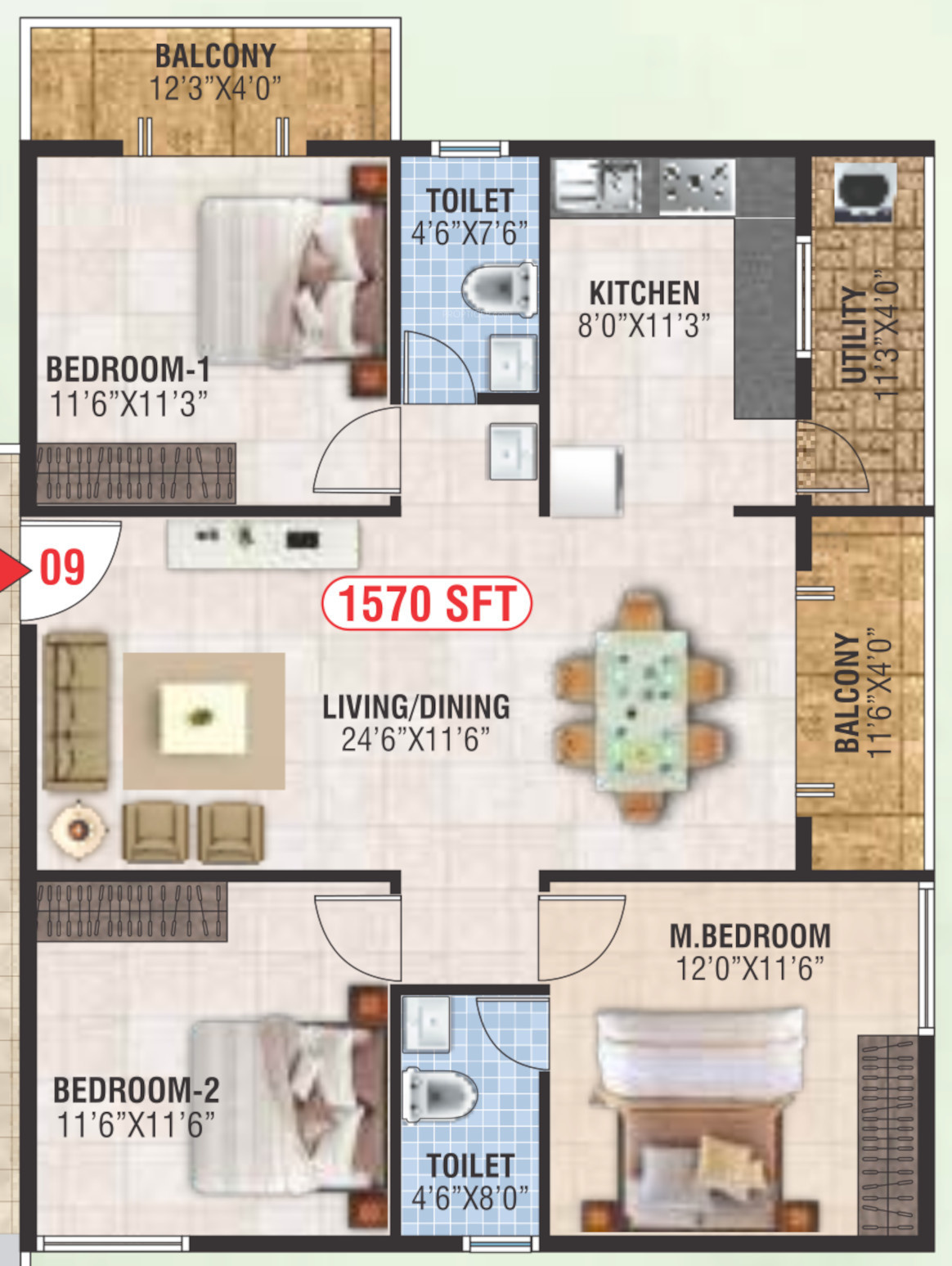 ![]() | 1570 sq ft (3BHK+3T) | - |