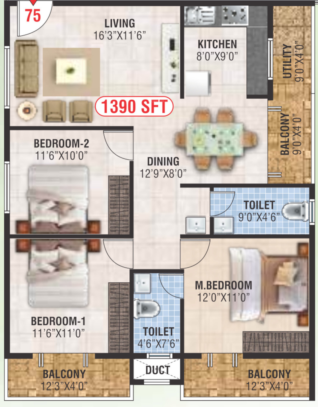 ![]() | 1755 sq ft (3BHK+3T) | - |