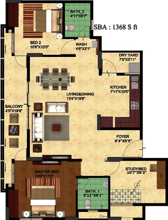 ![]() | 1368 sq ft (2BHK+2T) | - |