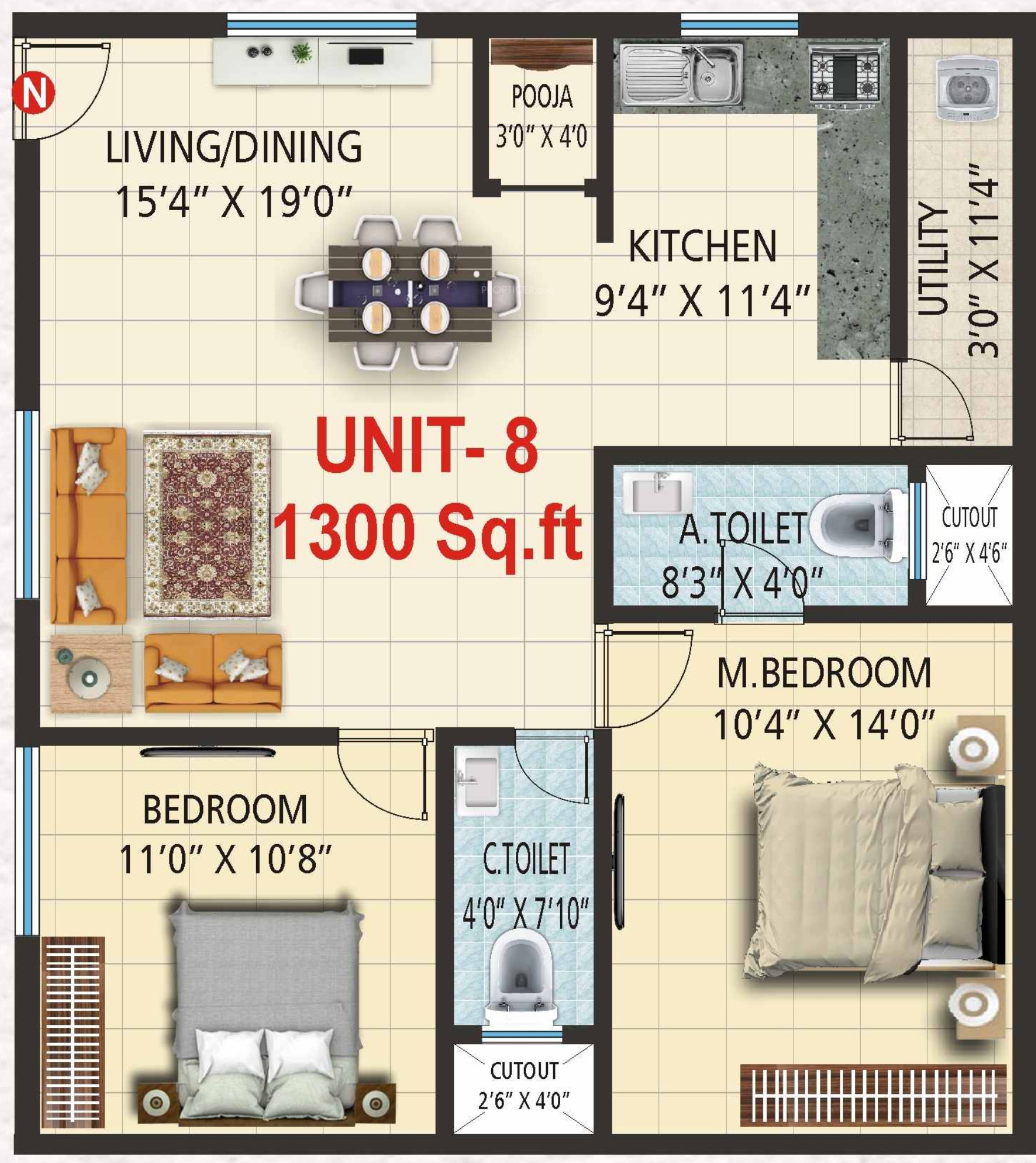 ![]() | 1300 sq ft (2BHK+2T) | - |