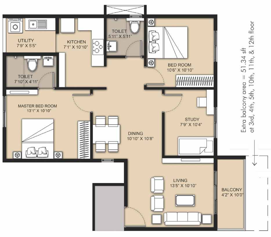 1250 sq ft (2BHK+2T + Study Room) | ₹ 65.70 L | |