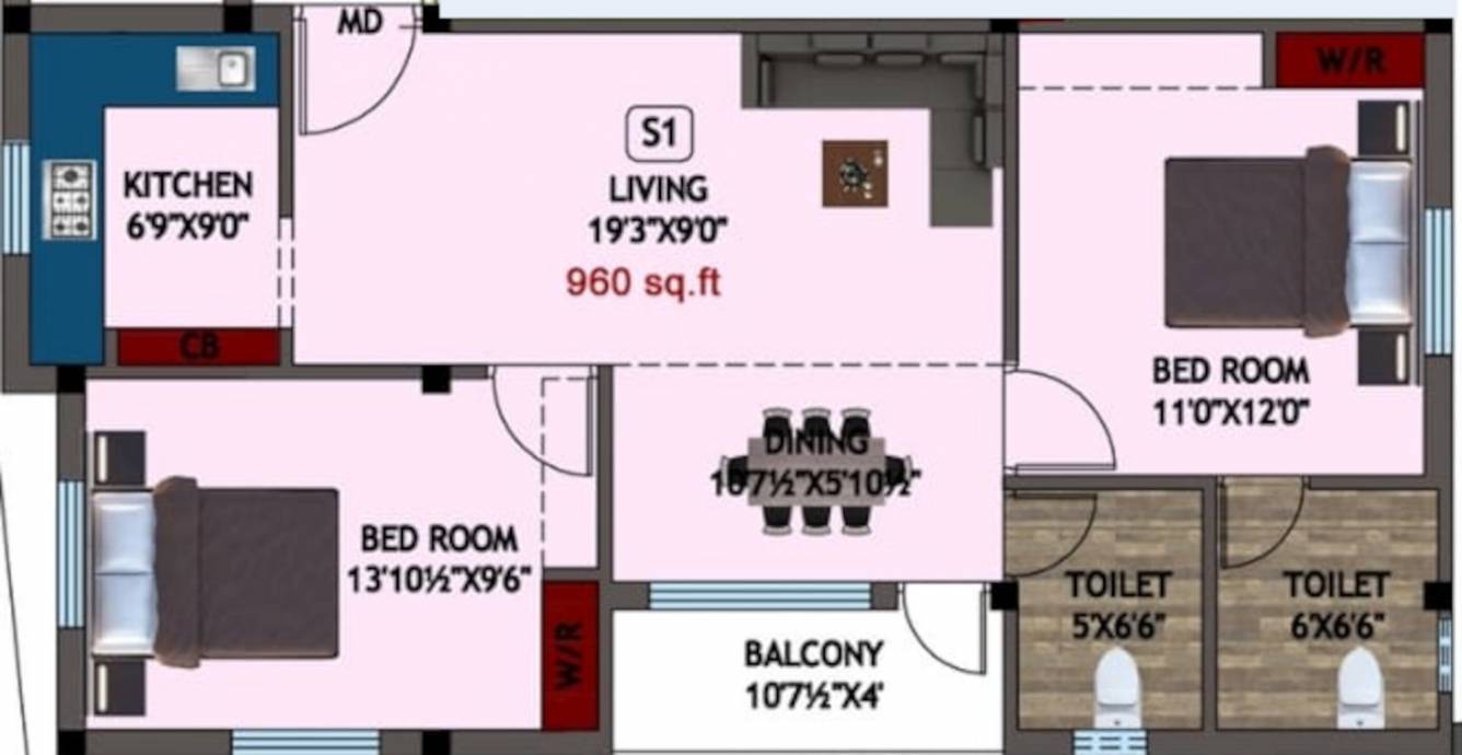 2BHK+2T (960 sq ft)