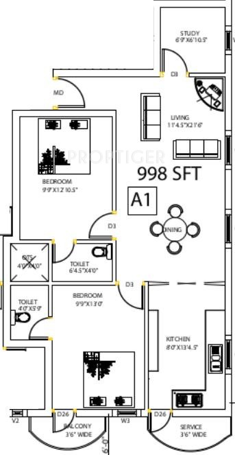 2BHK+2T (998 sq ft) Study Room