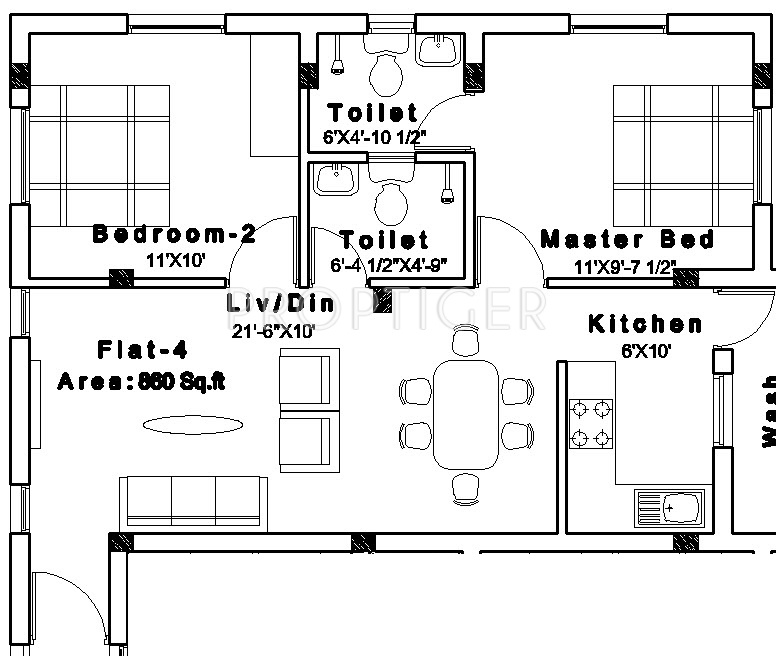 2BHK+2T (860 sq ft)