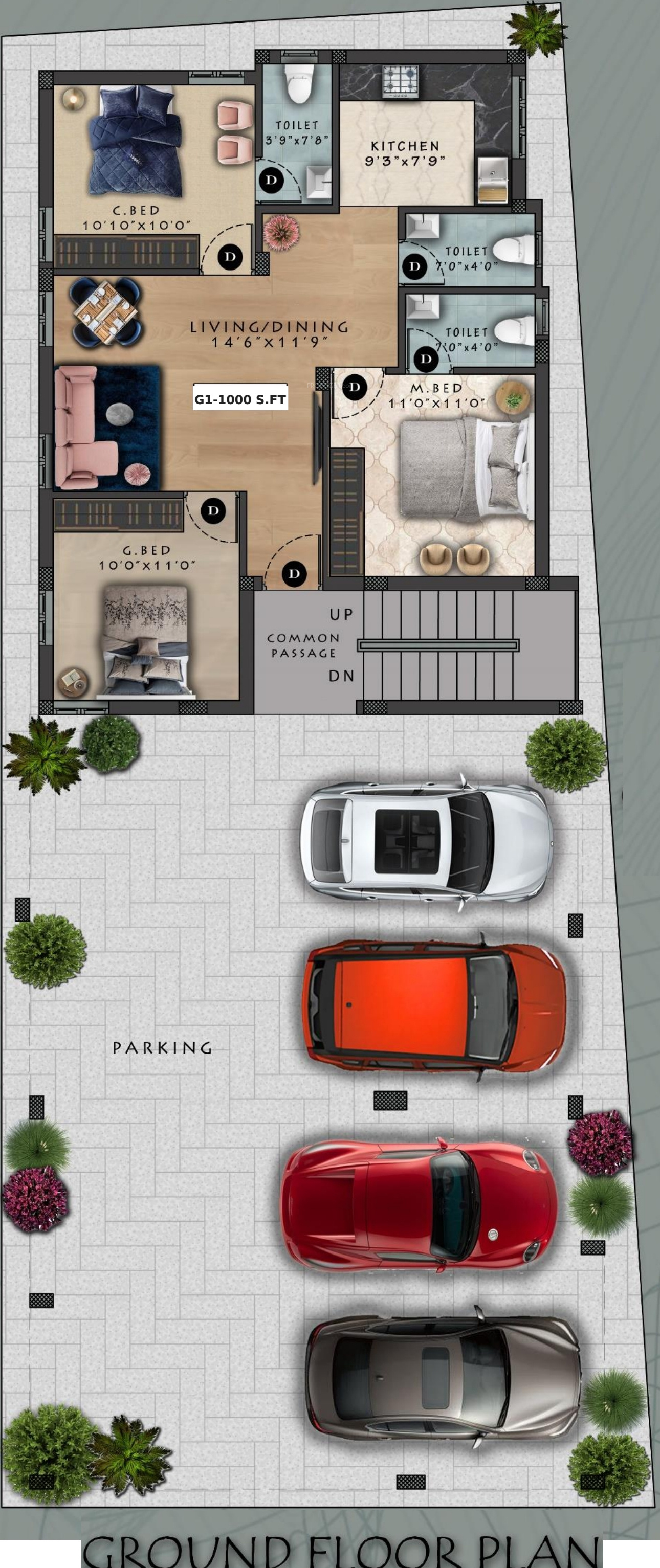 3BHK+3T (1,000 sq ft)