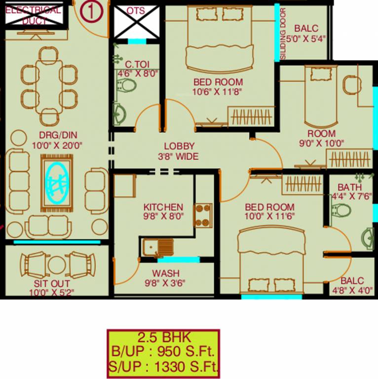 3BHK+2T (1,330 sq ft)