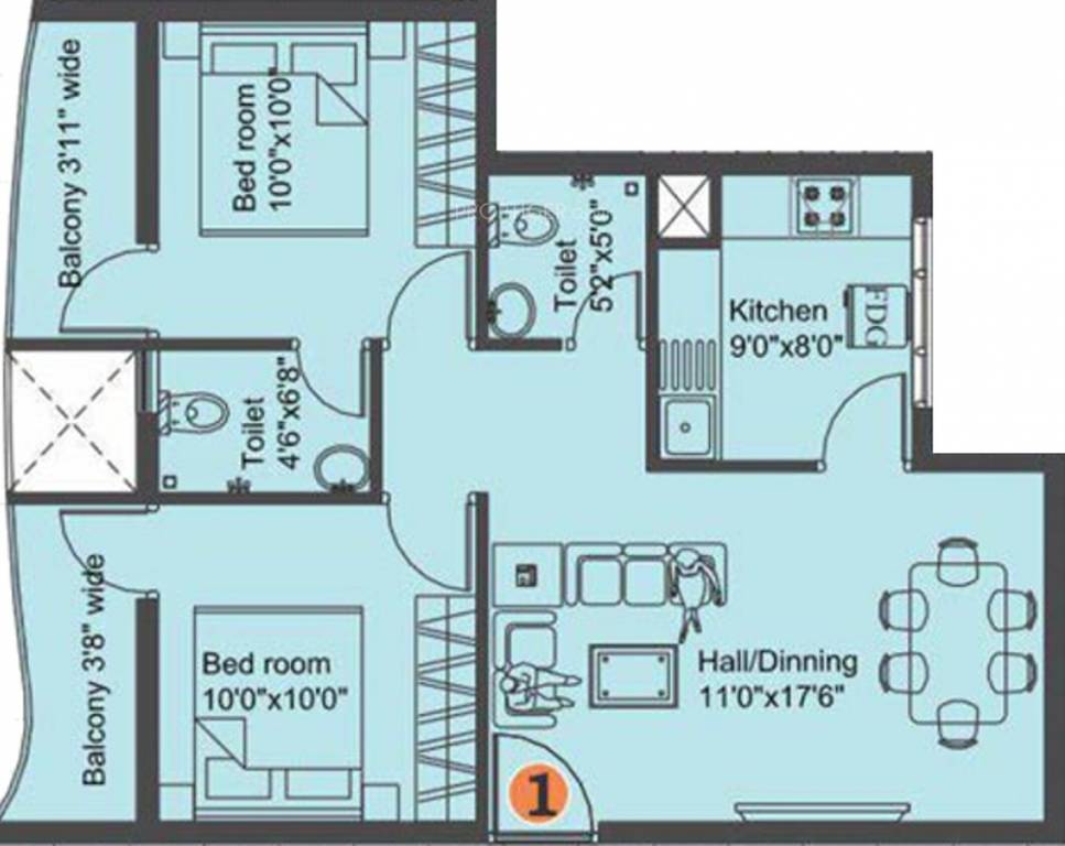 2BHK+2T (875 sq ft)