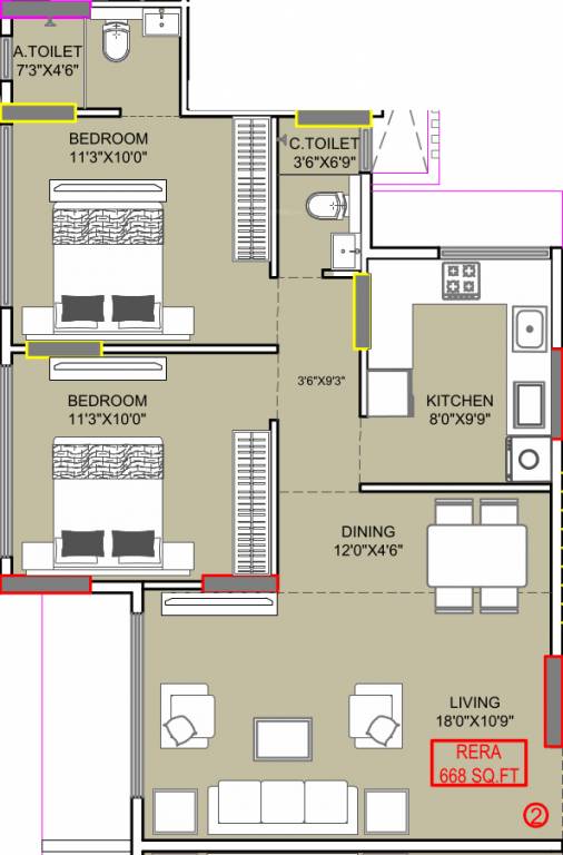 2BHK+2T (668.01 sq ft)