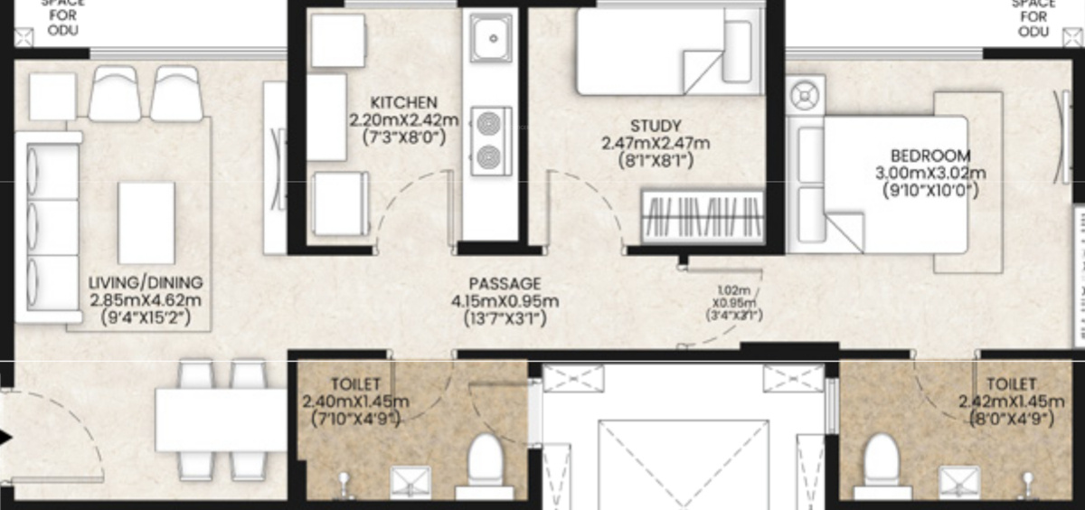 1BHK+1T (536.80 sq ft) + Study Room